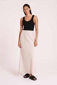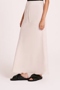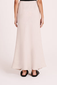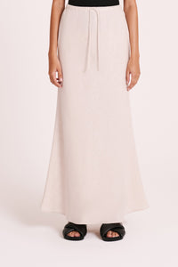 The Amani Linen Skirt in natural is made from a premium linen which has been washed for a smooth, soft hand feel. Cut on the bias, this silhouette finishes just above the ankles. Features include encased elasticated waistband with a self cut draw string at centre front.