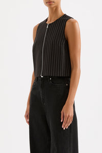 The Maeve Pinstripe Vest is made from a midweight tailoring fabric which has a smooth handfeel. The silhouette is comfortable and cropped, finishing at the waist. Features include a crew neckline and a centre front zipper opening with branded zipper puller.
