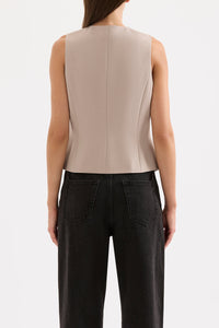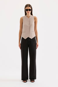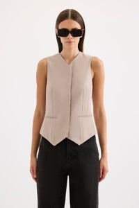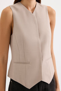 The Wallace Vest is made from a midweight tailoring fabric which has a smooth hand feel and a subtle visual texture. The silhouette is tailored and slim fitting with a button front opening. Features include a v neck, jetted pockets and a concealed button placket. The Wallace Vest is fully lined.