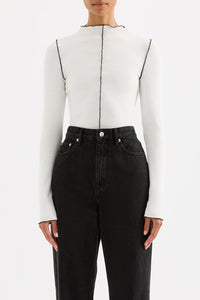 The Xander LS Top is made from a lightweight textured fabric that is stretchy and soft on the skin. The silhouette is a close fitting with length finishing at the hips. Features include a raised neckline, long fitted sleeves, and contrast baby locked neckline, centre front seam and hems.