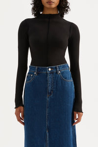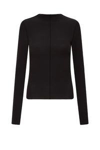 The Xavier LS Top is made in an cotton ribbed fabric which has a soft handfeel. The silhouette is a close fitting with length finishing at the hips. Features include a raised neckline, long fitted sleeves, and baby locked neckline, centre front seam and hems.
