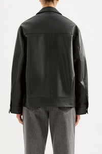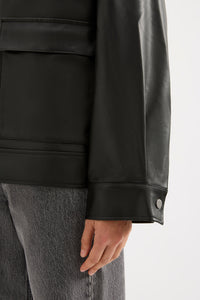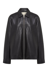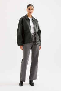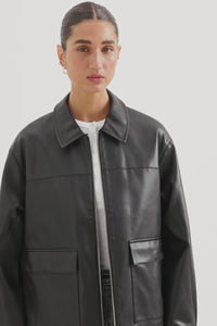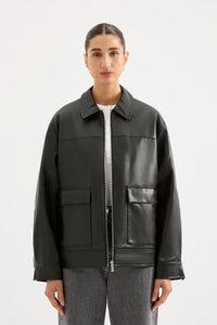 The Yaz Faux Leather Jacker is made from a luxe PU fabrication and has a smooth, buttery finish. The silhouette is relaxed with a drop shoulder and length finishing above the hips. Features include zipper opening and patch pockets.