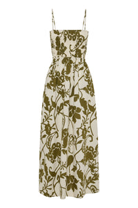 The Dahlia Maxi Dress is made from a linen blend fabrication in our exclusive Dahlia print. The silhouette is fitted to the waist with an a line skirt finishing just above the ankle. Features include a shirred bodice with a square neckline, adjustable straps and side seam pockets.