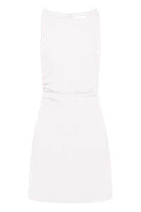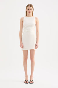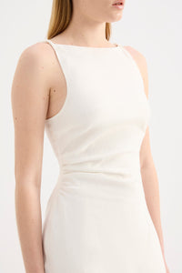 The Lotta Linen Mini Dress is made from a breathable 100% linen that has a soft hand feel. This silhouette is slim fit with an A-line mini skirt. Features wide boat neck with twist detail straps, gathers through waist create a flattering fit and invisible zipper at back. This dress is fully lined.