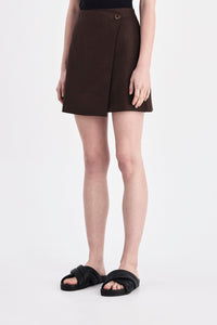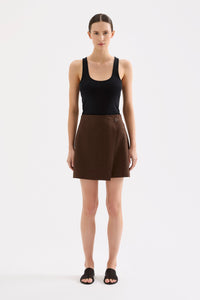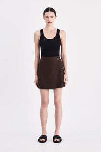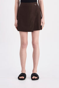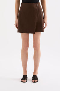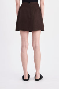 The Thilda Linen Mini Skirt in white is made from 100% linen which has been washed for a soft, breathable hand feel. The silhouette is high waisted and mini in length. Features include mock wrap front panel, mock shell button and invisible zipper at back. This skirt is fully lined.