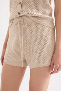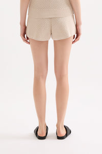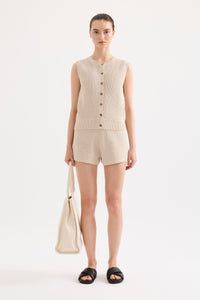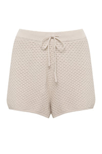 The Frazer Knit Short is made from a cotton blend yarn with a soft, dry hand feel and a textured knit construction. The silhouette is worn high on the waist and is mini in length. Features include a soft ribbed waistband and hem, encased elasticated waistband and drawcord.