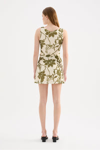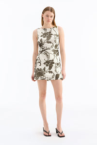 The Dahlia Mesh Mini Dress is made from a stretch jersey in our exclusive Dahlia print. The silhouette is fitted through the body, with a slight A-line shape at hem and mini in length. Features include a wide boat neckline and soft gathering through the waist. This dress is fully lined.