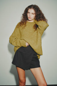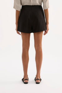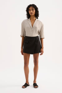 The Agnes Skort is made from a mid weight cotton lyocell blend fabrication which has a soft, breathable hand feel and subtle texture. The skort silhouette is high waisted and mini in length. Features include an asymmetrical front wrap panel, faux pocket design detail, branded Nude Lucy button and invisible zipper at back.