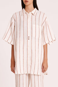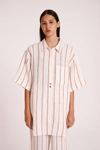 The Aisha Linen Shirt is made from our premium linen fabrication in our exclusive Amber Stripe. The silhouette is oversized with a drop shoulder and length finishing below the hips. Features include classic shirt details, contrast coloured button detail and front patch pocket.
