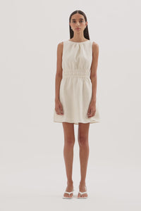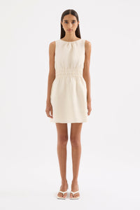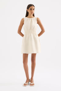 The Andri Linen Mini Dress is made from premium linen fabrication with a breathable, soft hand feel. This mini dress features a high boat neckline, shirred elastic waist, side seam pockets, invisible zipper at back and gathers at front neck.