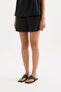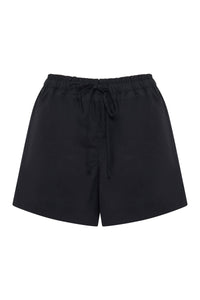 The Aries Short is made from a cotton poplin which has be washed for a smooth, crisp hand feel. The silhouette is relaxed and sits high on the waist with a wide leg opening. Features include an elasticated waistband with thin ties, inseam pockets and a subtle paper bag waist.