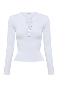 The Binx Long Sleeve Top is made in an organic cotton which has a high stretch and ribbed effect. The silhouette is a flattering close fit with a crew neckline and length finishing at the hips. Features include long fitted sleeves, snap button closure. This can be tucked in or worn over midrise bottoms.