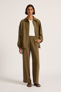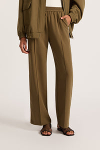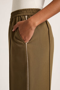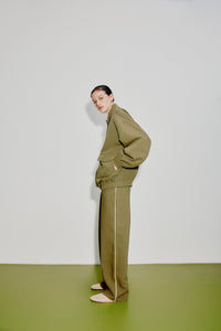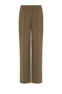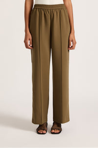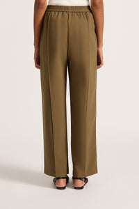 The Blake Pant is made from a mid weight tailoring fabric. The silhouette is relaxed with a wide full length leg. Features include an elasticated waistband, pin stitch down the centre of the legs, contrast bind detail at sides and side seam pockets.