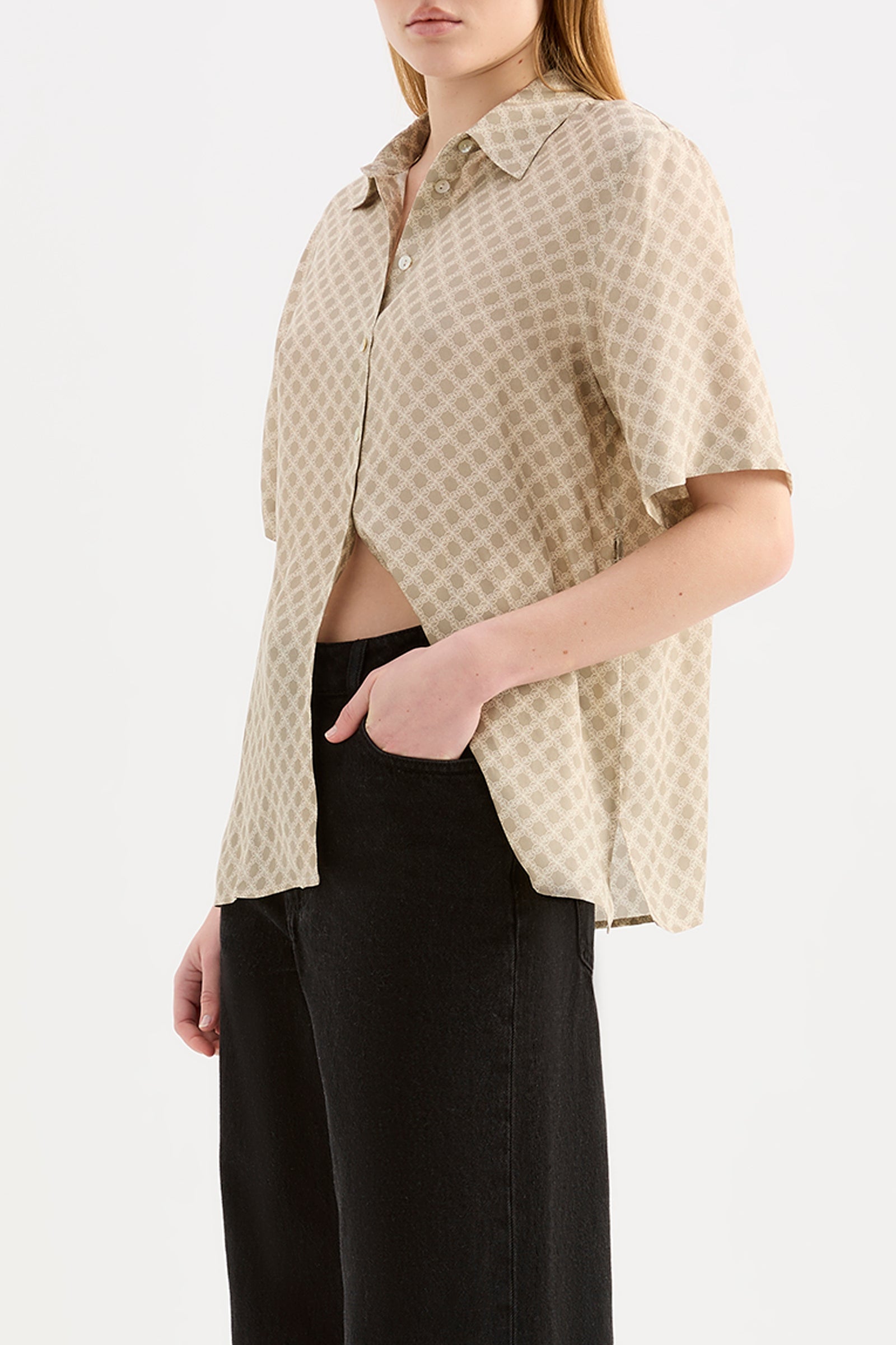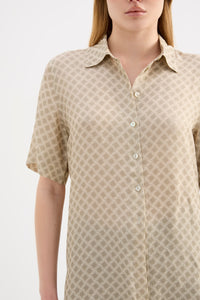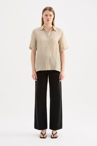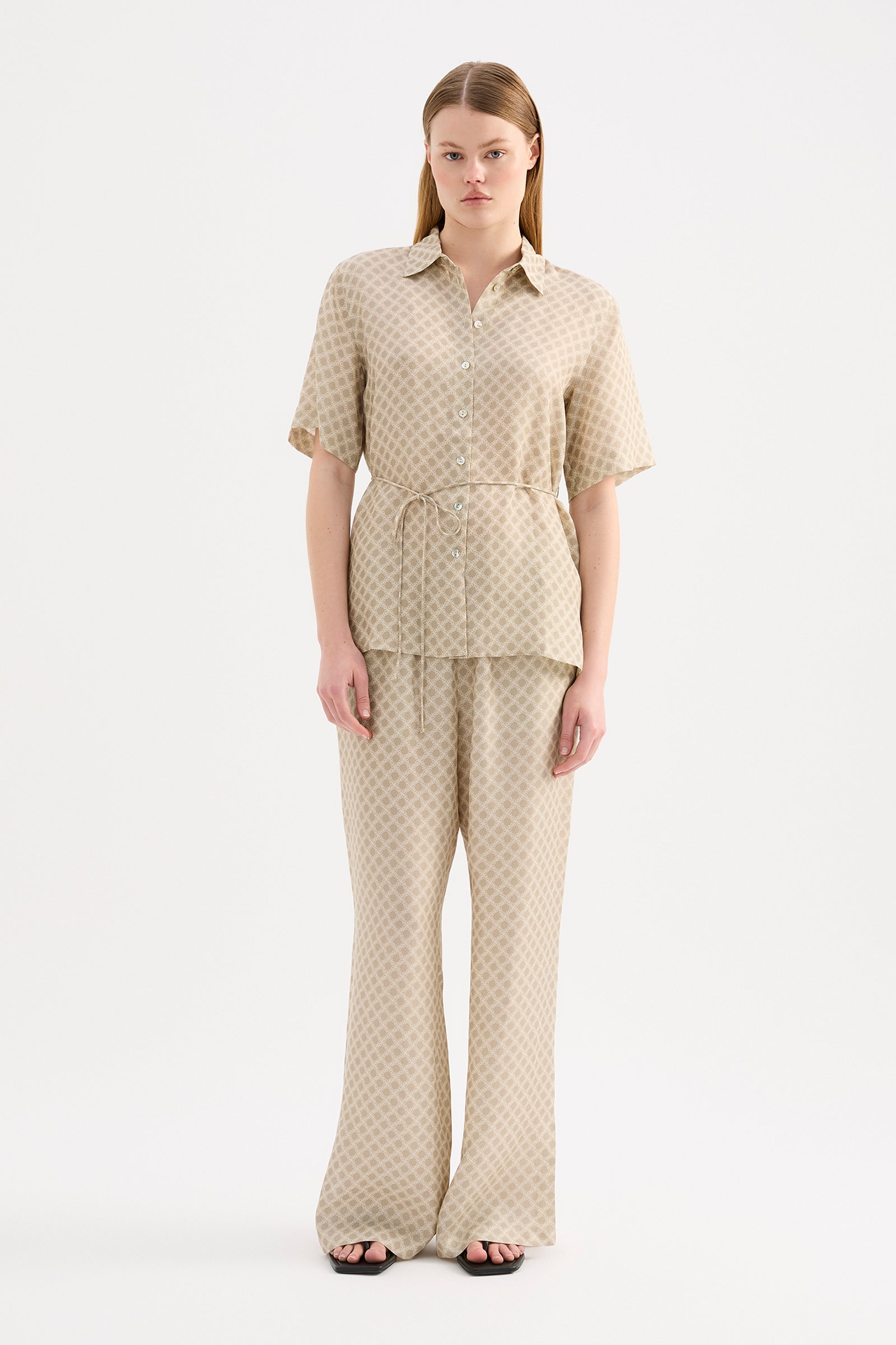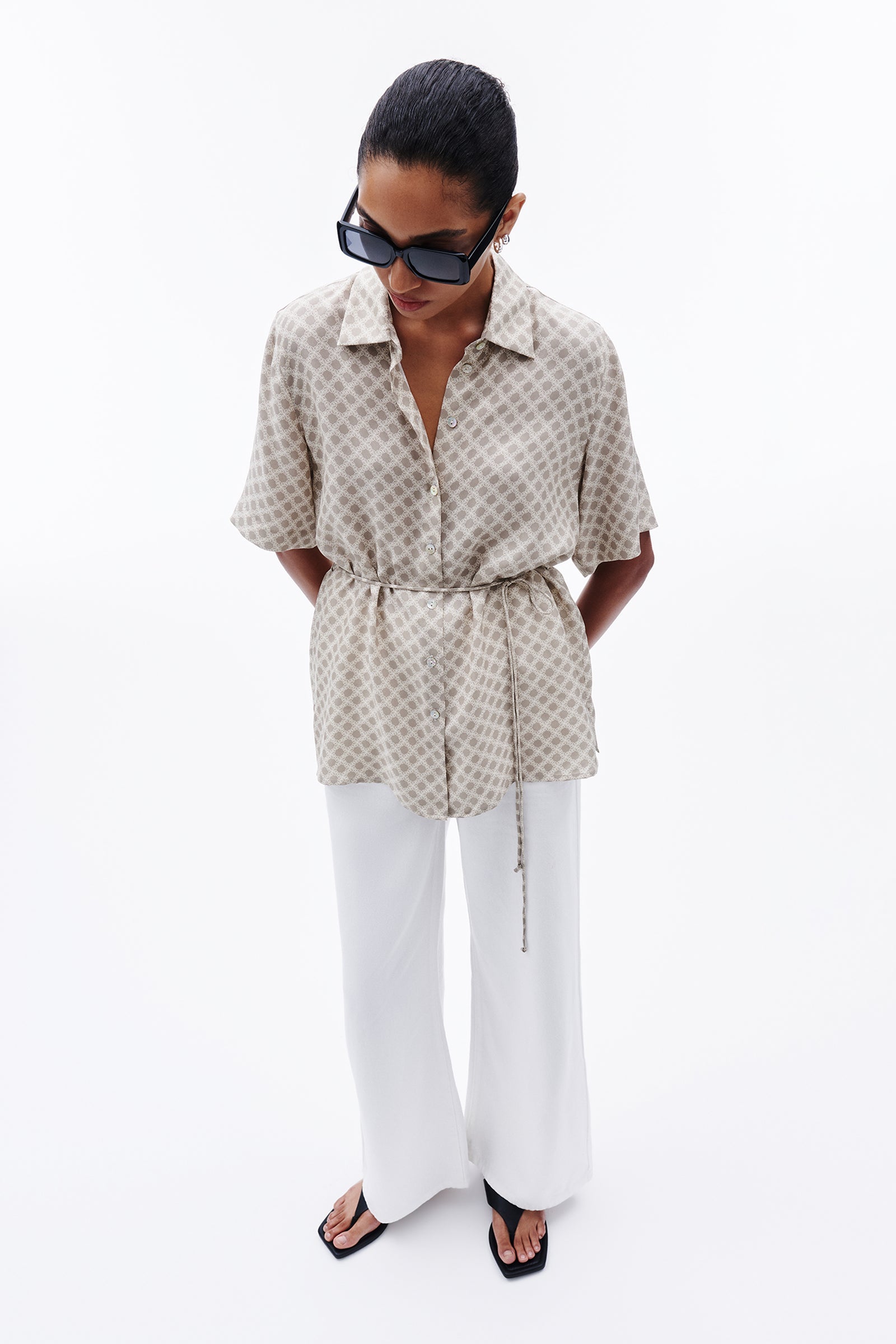 The Cosmos Cupro Shirt is made in our signature cupro fabrication in our exclusive Cosmos print. The silhouette is an oversized fit, with length finishing at the hip. Features include classic shirting details, back yoke, thin rouleau waist tie and shell buttons.