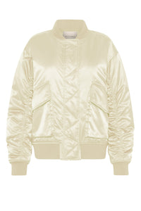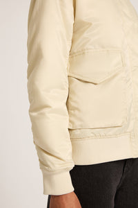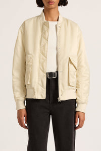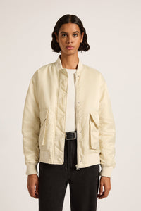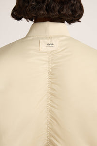 The Crawford Bomber Jacket is made from a recycled lightweight nylon with a silky hand feel. The silhouette is oversized with dropped shoulder and finishes at hip length. Features include patch pockets, signature Nude patch label on centre back, gathering detail on sleeve and rib finishing on sleeve cuff and hem.