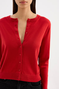 The Elvio Merino Blend Cardigan is made from a lightweight merino blend yarn with a subtle marle and soft hand feel. The silhouette is a relaxed crew neck cardigan finishing at hip length. Features include centre front button opening and soft rib neckline, cuffs and hem.