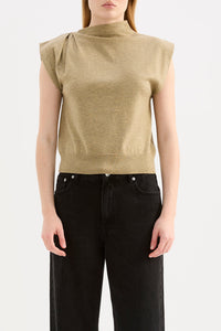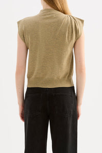 The Elvio Merino Blend Top is made from a lightweight merino blend yarn with a subtle marle and soft hand feel. The silhouette is a raised neck tank shape, finishing at hip length. Features include asymmetrical neckline with tuck detail, sawn off armhole shape and soft rib hem.