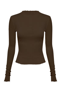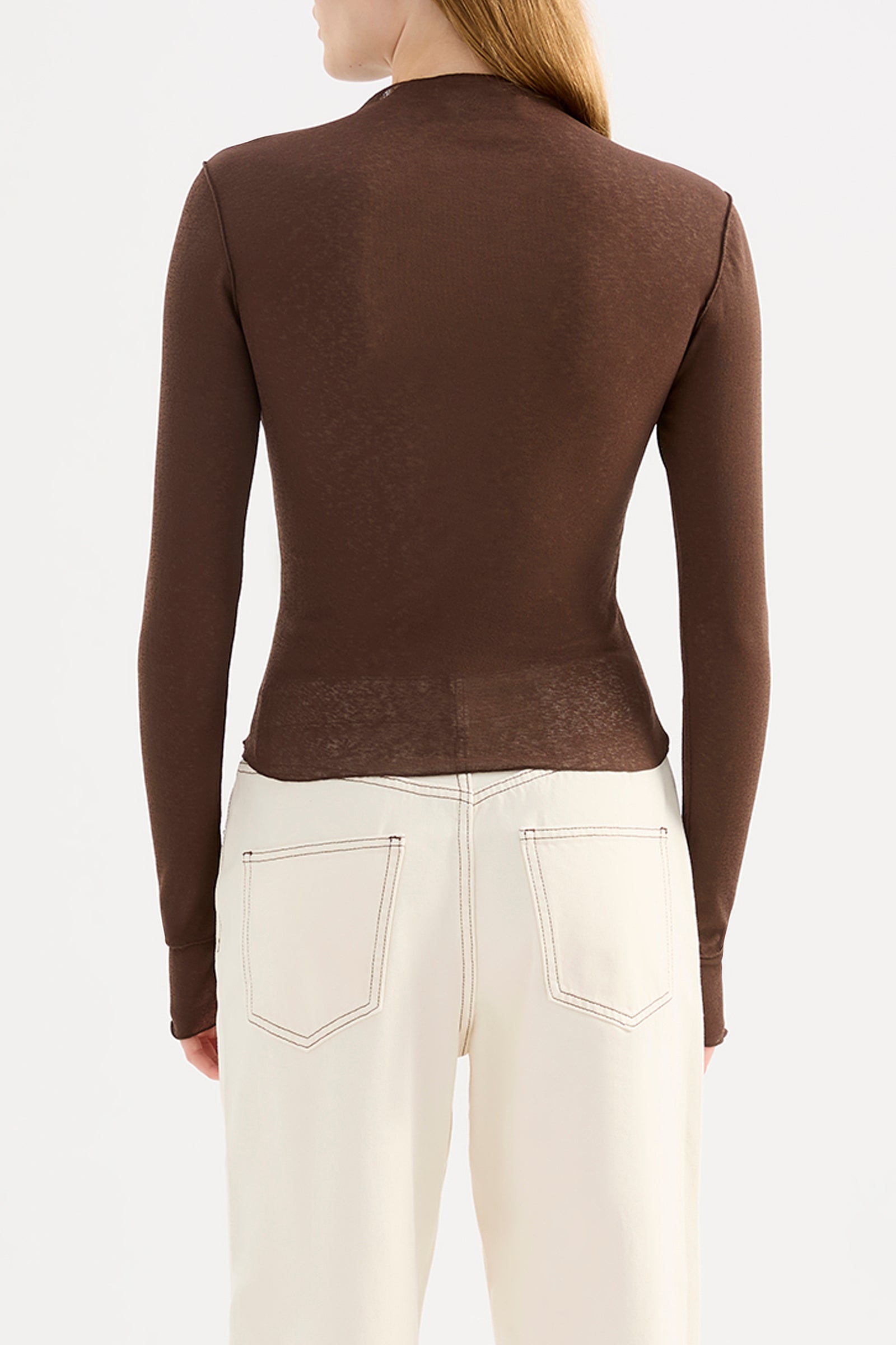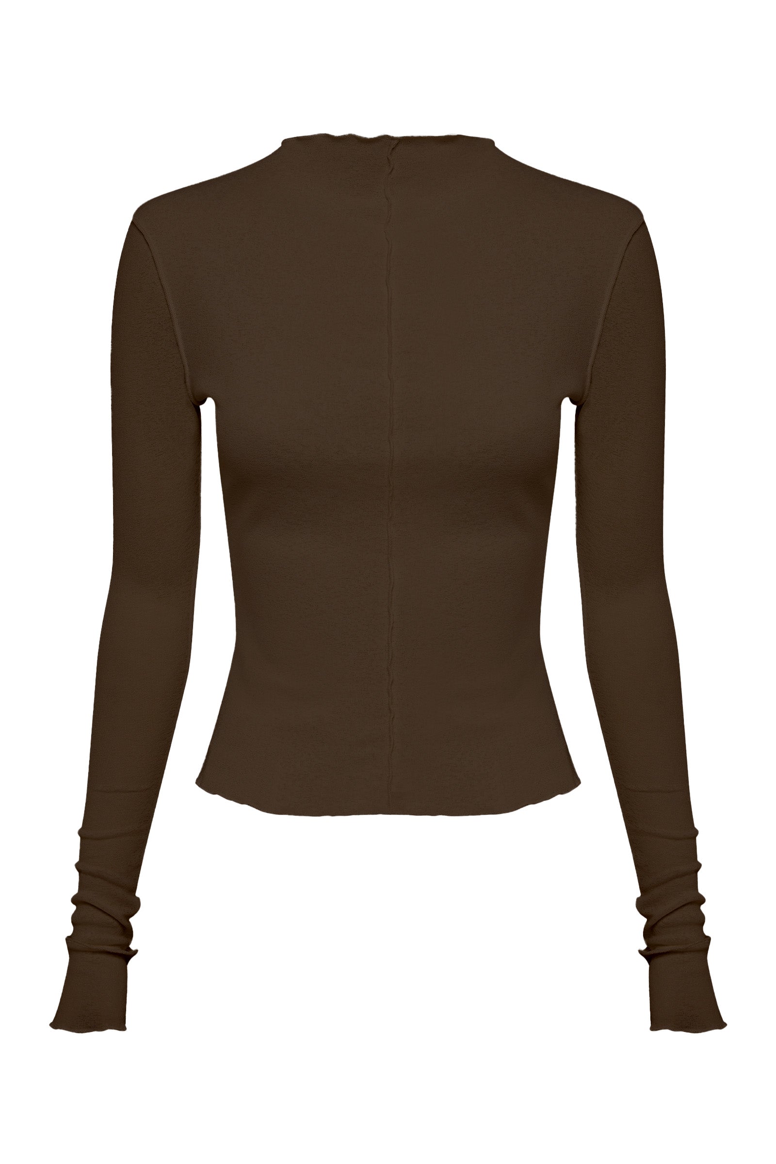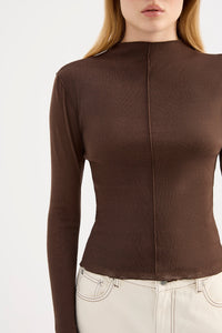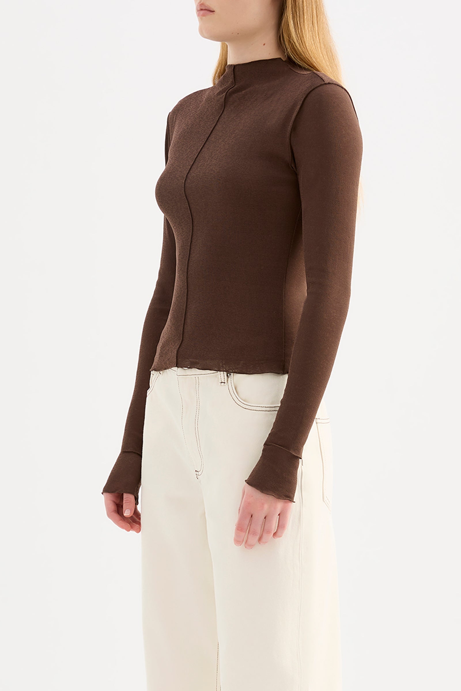 The Emmy Top is made from a stretch jersey with a dry hand feel. The silhouette is a form fitting long sleeve top with length finishing at the hip. Features include a raised neckline, long fitted sleeves, and baby locked neckline, seams and hems.