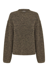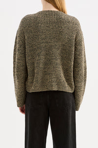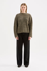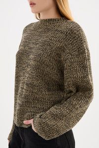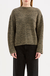 The Hana Knit is made from a midweight, cotton blend yarn with a soft and smooth hand feel. The silhouette is relaxed with a high neck and length finishing at the hips. Features include two-tone yarn and rib knit construction.