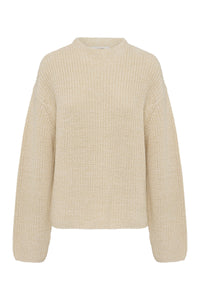 The Hana Knit is made from a midweight, cotton blend yarn with a soft and smooth hand feel. The silhouette is relaxed with a high neck and length finishing at the hips. Features include two-tone yarn and rib knit construction.