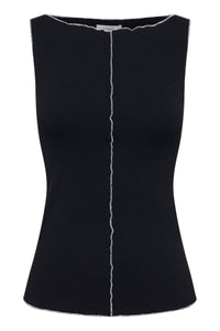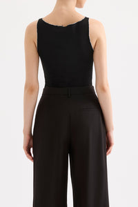 The Hilda Tank is made from a lightweight textured jersey that is stretchy and soft on the skin. The silhouette is slim fitting with a boat neck and length sitting at hip level. Features include contrasting baby locked edges.