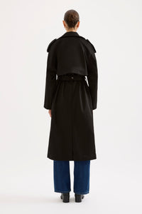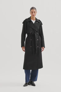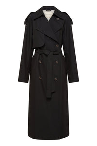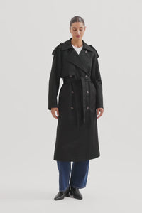 The Kaiya Trench is made from a heavyweight cotton fabric which has a twill finish. The silhouette is relaxed with wide, full length sleeve and body length finishing below the knees. Classic trench coat features, including storm flap, waist tie and welt pocket pockets.