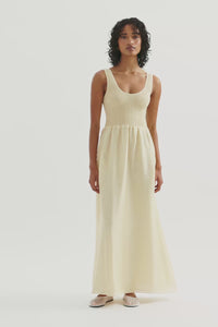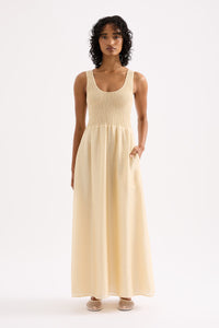 The Kova Maxi Dress is made from a light weight lyocell blend fabric which is slightly sheer and has a smooth hand feel. The silhouette is feminine and relaxed with a shirred bodice and soft billowing skirt that finishes above the ankle. Features include a scooped neckline with thick straps. This dress is fully lined.