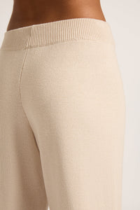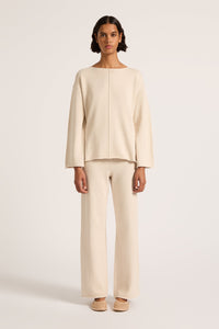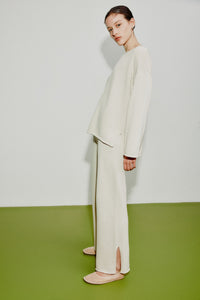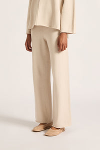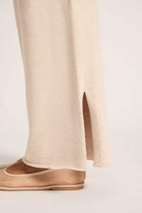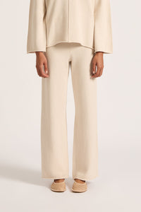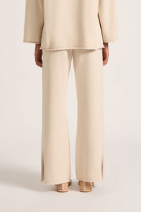 The Lilou Knit Pant is made from a cotton yarn with an extra soft hand feel. The silhouette is a high rise, relaxed wide leg pant. Features include a an elasticated waistband and side slits at hem.
