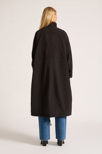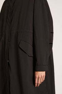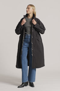 The Logan Anorak is made from a lightweight recycled nylon which has a crisp hand feel and is water resistant. The silhouette is relaxed with long sleeves and length finishing above the ankles. Features include zipper and snap opening, functional internal draw cord at waist and hem, side front pockets and elasticated cuff.