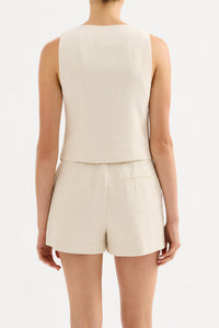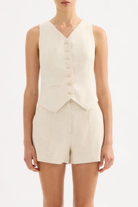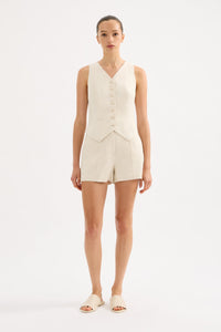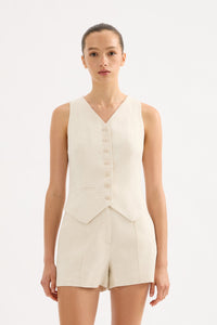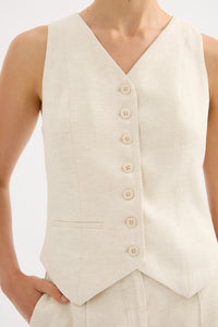 The Logan Tailored Vest is made from a viscose blend fabrication which has a dry hand feel and a slub linen yarn throughout giving a light speckled appearance. The silhouette is tailored and slim fitting with a button front opening. Features include a high v neck and Nude Lucy branded button. The vest is fully lined.