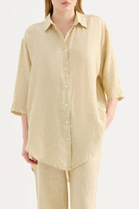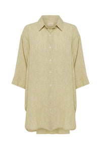 The Lounge Stripe Linen Long Shirt is made in a premium 100% organic French linen which has been washed down for a soft and breathable hand feel and features an exclusive yarn dyed stripe. The silhouette is relaxed and oversized with a long billowing hemline and side slits. Features include classic shirt detailing with collared neckline, button front opening, 3/4 sleeves and a Nude Lucy branded label. This Longline Shirt can be worn by itself or paired with a Nude Lounge bottom.