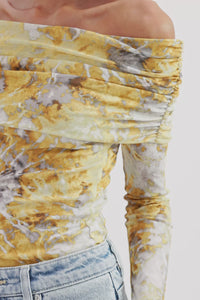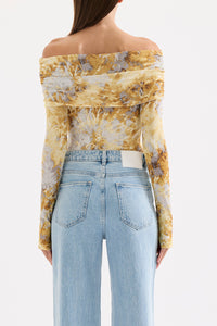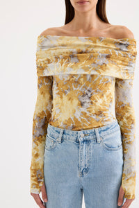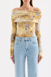 The Dalton Mesh LS Top is made from a stretch jersey in our exclusive Lumine print. Silhouette is a flattering close fit with full length sleeves and length finishing at the hip. Features include a foldover off shoulder neckline and thumbholes.