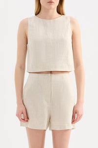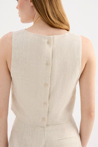 The Marli Linen Top is made from a premium linen which has been washed for a smooth, soft hand feel. The silhouette is a clean, casual cropped fit which finishes at the waist. Features include a wide, crew neckline and button opening at centre back.