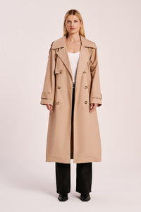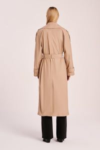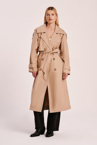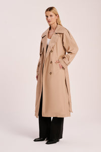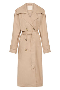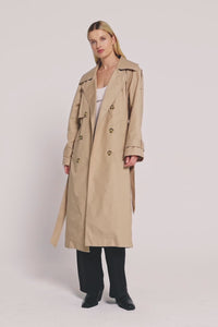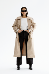 The Milo Trench coat is made from a lightweight cotton blend fabrication which has a soft, peached hand feel. The silhouette is relaxed with wide full length sleeves & body length finishing at calf level. Features include traditional trench coat detailing, double breasted button opening, waist tie & storm flap.