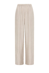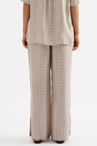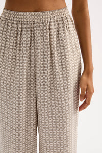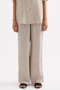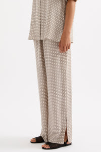 The Moneta Cupro Pant is made in our signature cupro fabrication in our exclusive Moneta print. The silhouette is a relaxed wide leg, full length pant. Features include an elasticated waistband, side seam pockets and slits at hem.