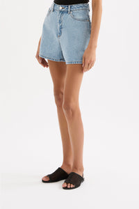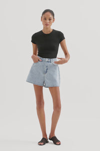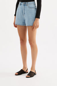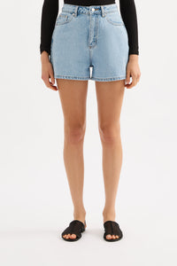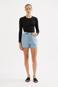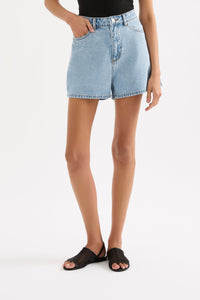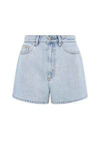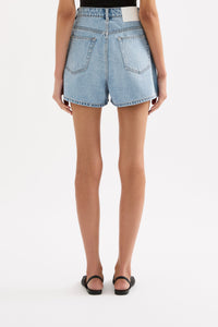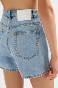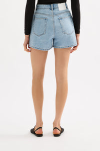 The Organic Mom Short is made from 12 oz 100% organic cotton denim, stone washed to an authentic stone wash blue. The silhouette is a classic high rise with relaxed leg and mini in length. Features include branded shank button, rivets & Jacron Back patch. Fits true to size, size up for a more relaxed fit.