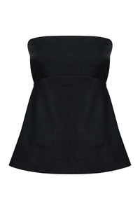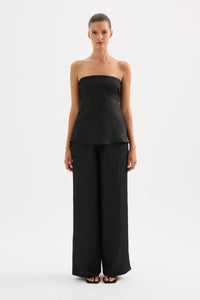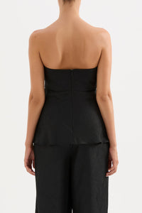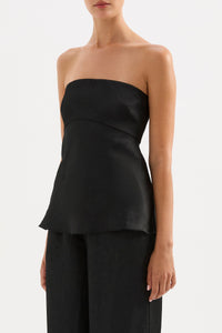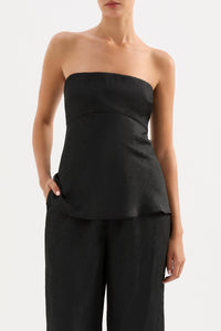 The Pandora Strapless top is made from a premium crushed satin featuring a luminous, gloss finish and subtle texture. The silhouette is strapless with a fitted bust and relaxed body finishing below hip with a softly fluted hemline. Features include an shaped empire waist line, gripper tape on inside neckline and invisible zipper opening.