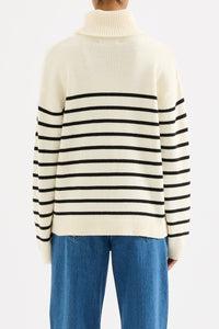 The Perri Turtleneck is made from a cotton blend yarn with a soft hand feel. The silhouette is relaxed with a dropped shoulder, and length finishing below the hips. Features include fold over turtleneck, placement stripe design, ribbed collar, cuff and hem.