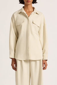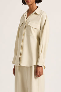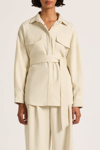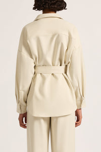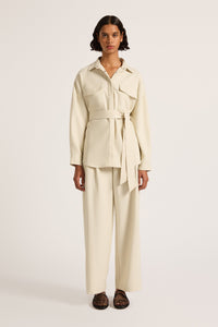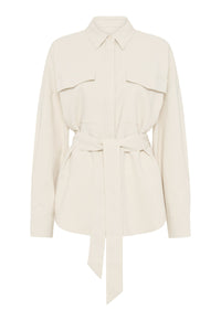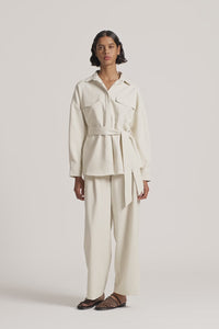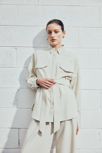 The Phoenix Shirt is made from a tailoring fabrication. The silhouette is oversized throughout with length finishing at the hips. Features include voluminous sleeves, a tie to cinch in the waist, front patch pockets and a curved hem shape.
