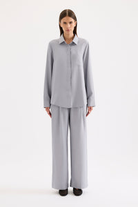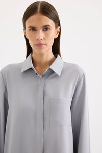 The Raine Shirt is made from a classic suiting fabrication that has a twill texture and a smooth hand feel. The silhouette is relaxed with drop shoulders and a slightly oversized body. Classic shirting features include a front patch pocket, traditional shirt collar and front branded button opening and a curved hem shape.