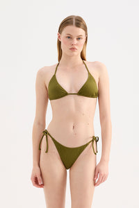 The Rib Triangle Top is made from a premium recycled stretch fabrication with a soft hand feel and wide rib finish. The top has a soft tri cup bust and thin elasticated halter straps. Features include adjustable neck and body.