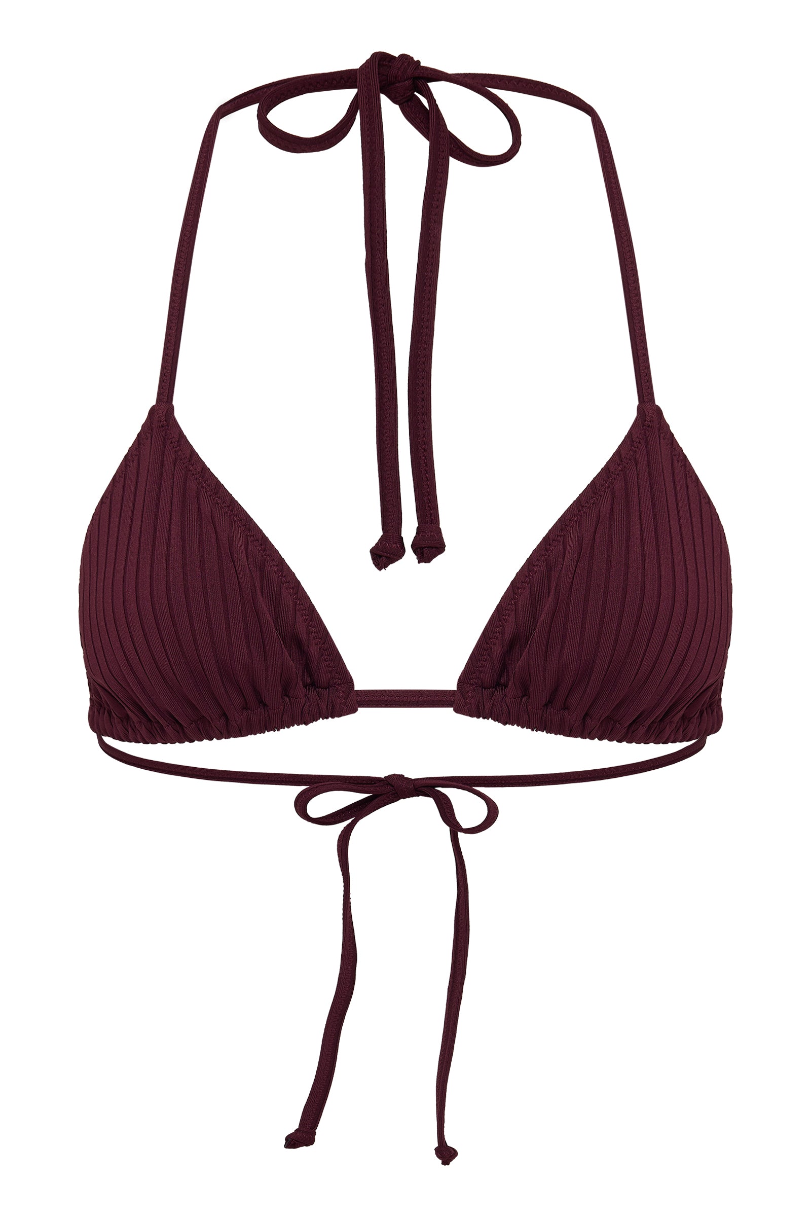The Rib Triangle Top is made from a premium recycled stretch fabrication with a soft hand feel and wide rib finish. The top has a soft tri cup bust and thin elasticated halter straps. Features include adjustable neck and body.