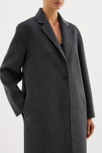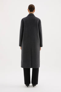 The Riley Wool Coat is made from a classic thick wool blend fabrication which has a soft, warm hand feel. The silhouette is relaxed with a lapel collar, dropped shoulder and length finishing above the ankles. Features include button front opening, side seam pockets and back vent.