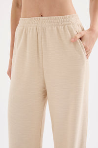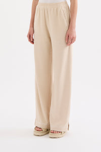 The Sutton Pant is made from a textured cotton linen blend fabric that is soft on the skin. The silhouette is a relaxed fit, high waisted, full length pant. Features include an elasticated waistband, contrast stitch detail, splits at hem and side welt pockets.