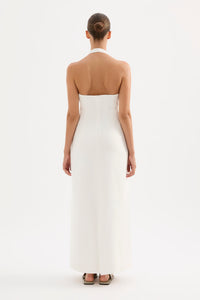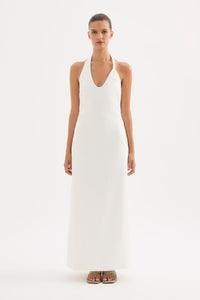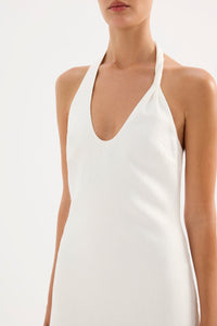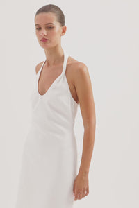The Zayda Linen Dress is made from 100% Linen which has been washed for a soft, breathable hand feel. This silhouette is slim fitting with a midi length finish. Features include a deep scoop neckline with a twisted halter neck strap, invisible side seam zipper and adjustable buttons at back neck.