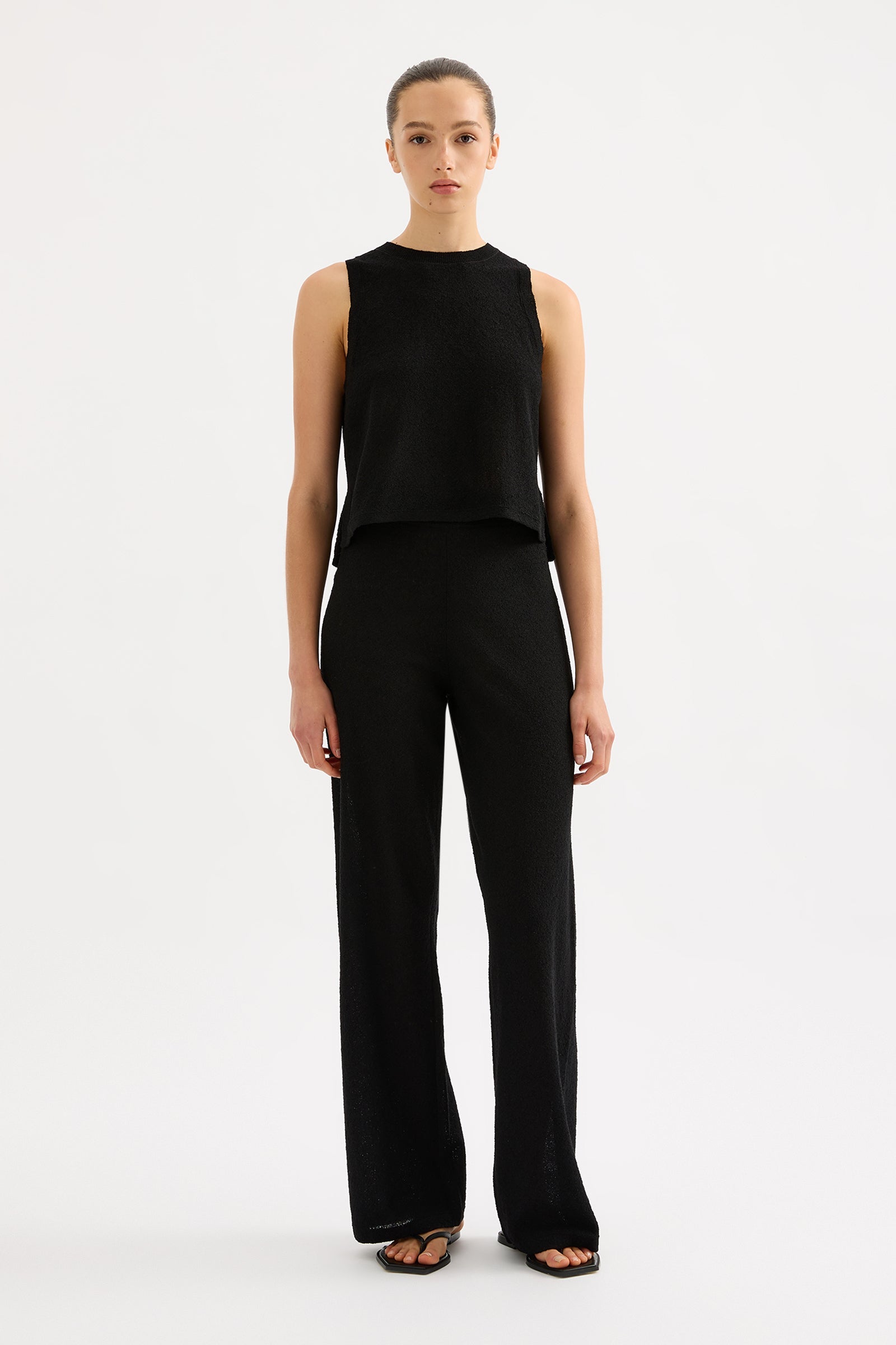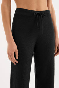 The Zosia Knit Pant in black is made in a lightweight, textured knit with a dry hand feel. The silhouette is a relaxed wide leg, full length pant. Features include a soft elasticated waistband with drawcord.